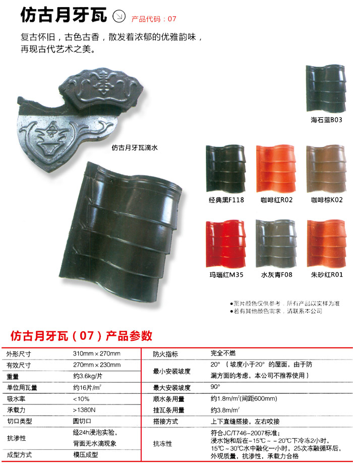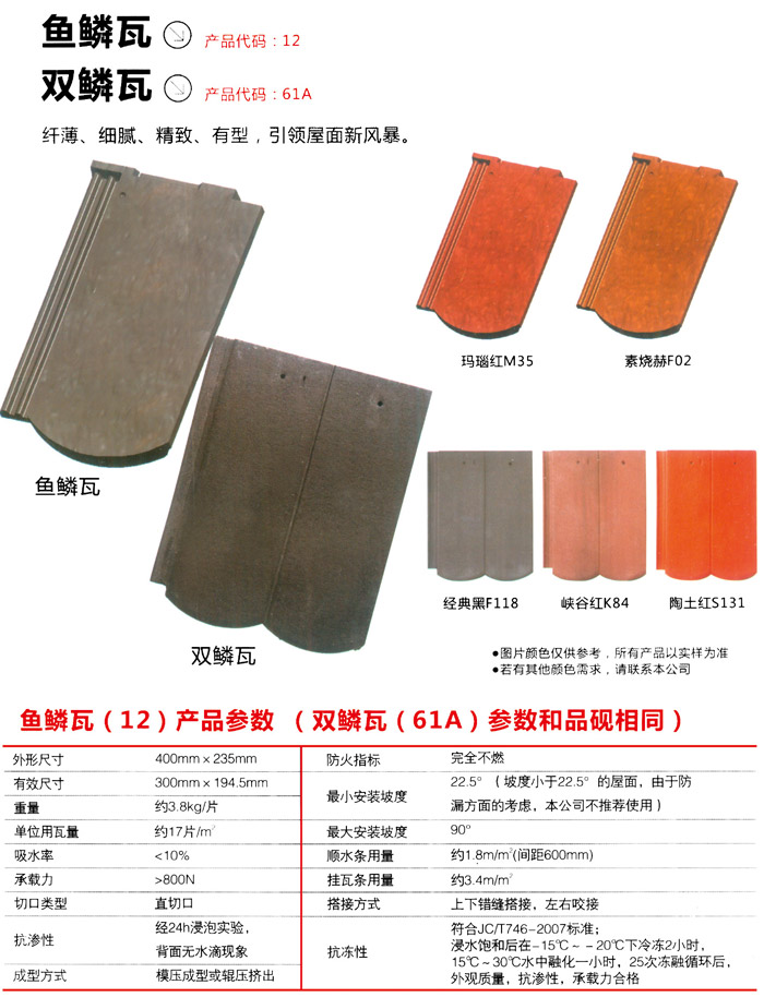 由于生產(chǎn)廠家用材不一樣因此色調(diào)也一些不一樣。在色調(diào)耐受性上,整體瓦比鍍層瓦好一些,整體瓦保色時(shí)間更久,鍍層瓦一般3-五年色調(diào)固色。從美觀大方上看,涂敷瓷磚表面光滑度高,一般瓷磚表面凸凹不平。因?yàn)榇纱u的表面上色是由混凝土黏合劑擠壓成型而成,因而不建議在風(fēng)雪比較嚴(yán)重的地域應(yīng)用涂有建筑涂料的瓷磚。