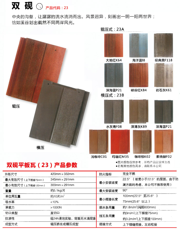 僅有壓濾機式模壓成型的精典水泥瓦才可以保證的瓦低谷部構造,使降水的排出更暢順更快速,防止了擠壓成型式成形的一般水泥瓦降水倒流的狀況。此外模壓成型的瓦才有的頭頂部高于一部分擋水功效,即應用在水準平屋面上,也不會出現降水倒流狀況。精典水泥瓦選用上、下模壓成型生產制造,外觀美觀大方栩栩如生,瓦表面光潔整平,規(guī)格嚴苛精確,相對密度勻稱一致。超過200KG的抗折強度得以讓施工隊伍在早已鋪裝的平屋面上走動輕松。